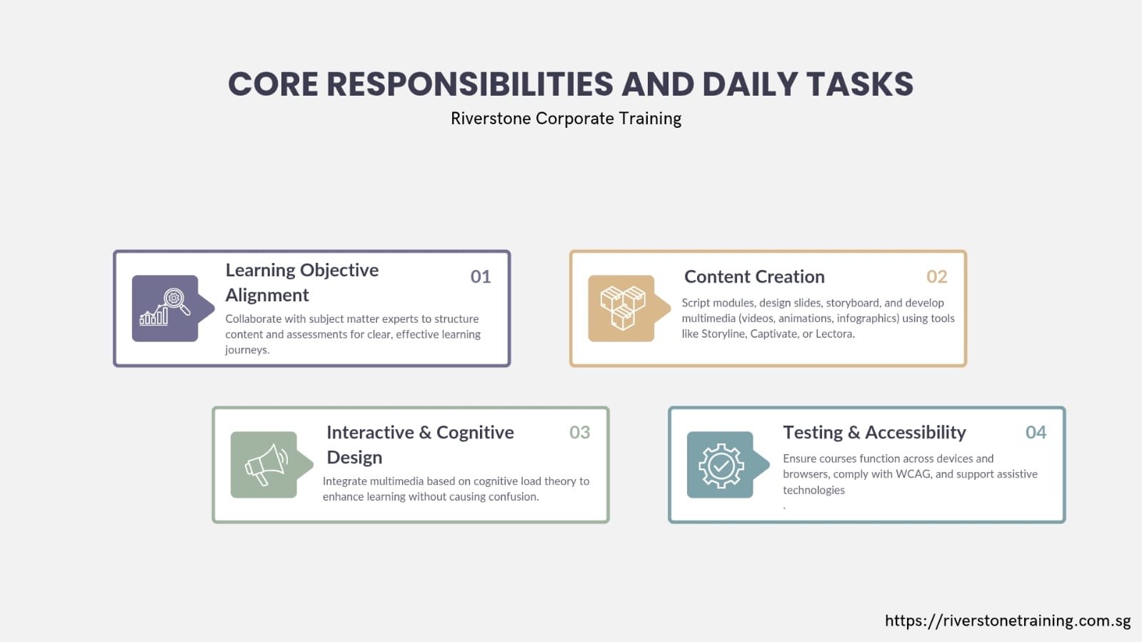 Content creation is one of the key roles of these people. This comprises the scripting of eLearning modules, slide designing, contributing to storyboarding as well as development of multimedia contents in terms of videos, animation, and infographics. Authoring tools such as Articulate Storyline, Adobe Captivate, or Lectora are also available to developers who want to develop interactive experiences that engage the learner and stimulate the use of active interaction. They also have multimedia elements integrated such that they correlate with the cognitive load theory ideology so that the images and sounds complement each other to enrich the learning process instead of confusing it.